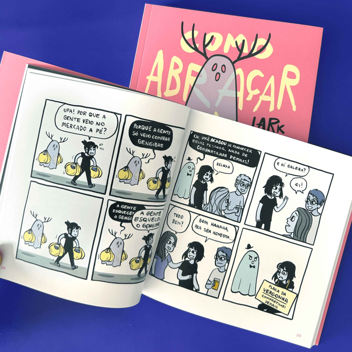 Essa relação ambígua entre uma pessoa absolutamente comum (ou talvez só um pouquinho maluca) e os três fantasmas barulhentos, teimosos e sentimentais que a acompanham é retratada nesse livro com bom humor em forma de tiras.